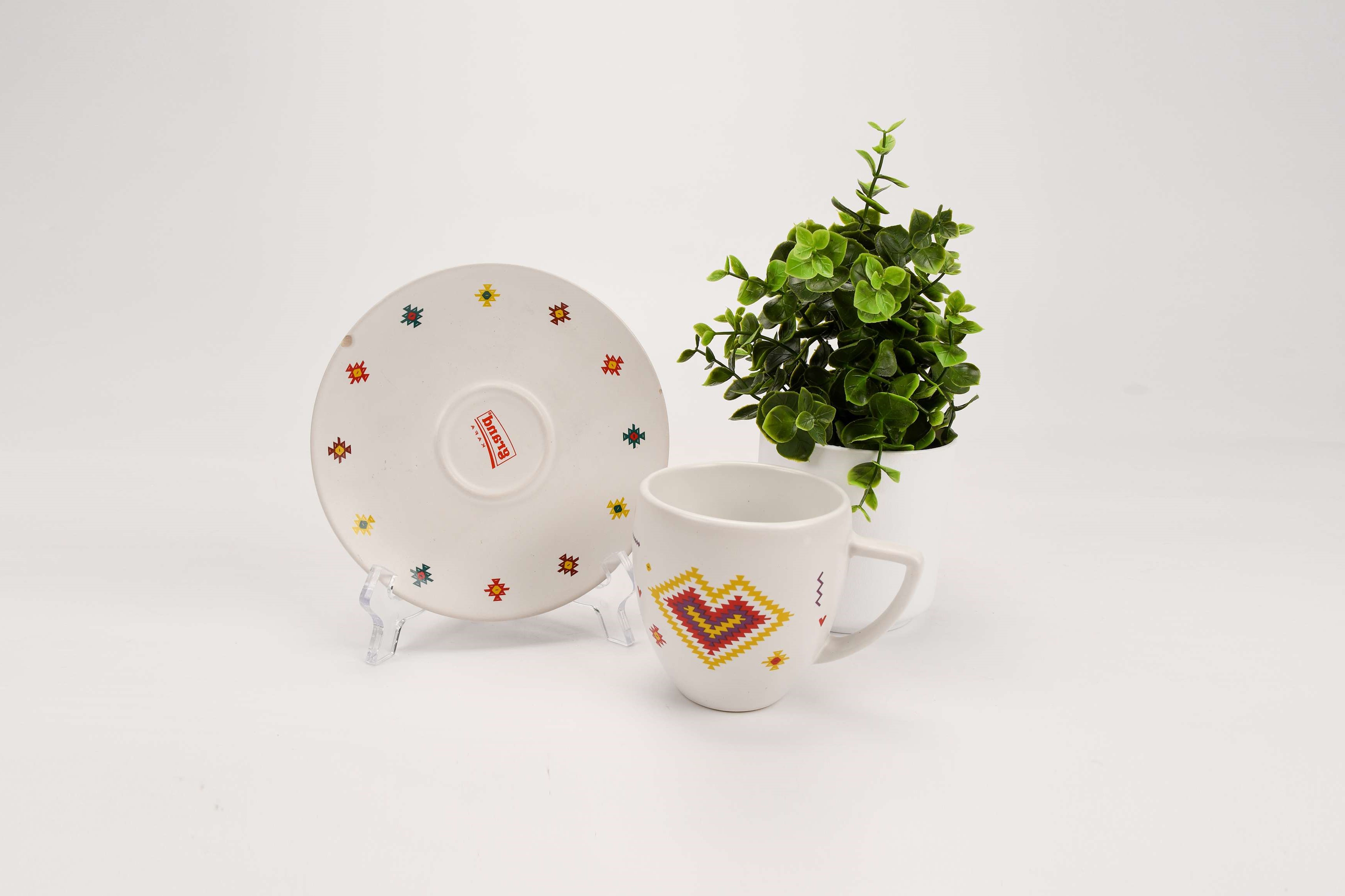 The pure white porcelain with ethnic geometric heart pattern is like a woven dream rhythm. The cup and saucer are exquisitely matched. Hold a cup of coffee and feel the unique artistic atmosphere in the afternoon. It is an elegant choice for coffee lovers.
