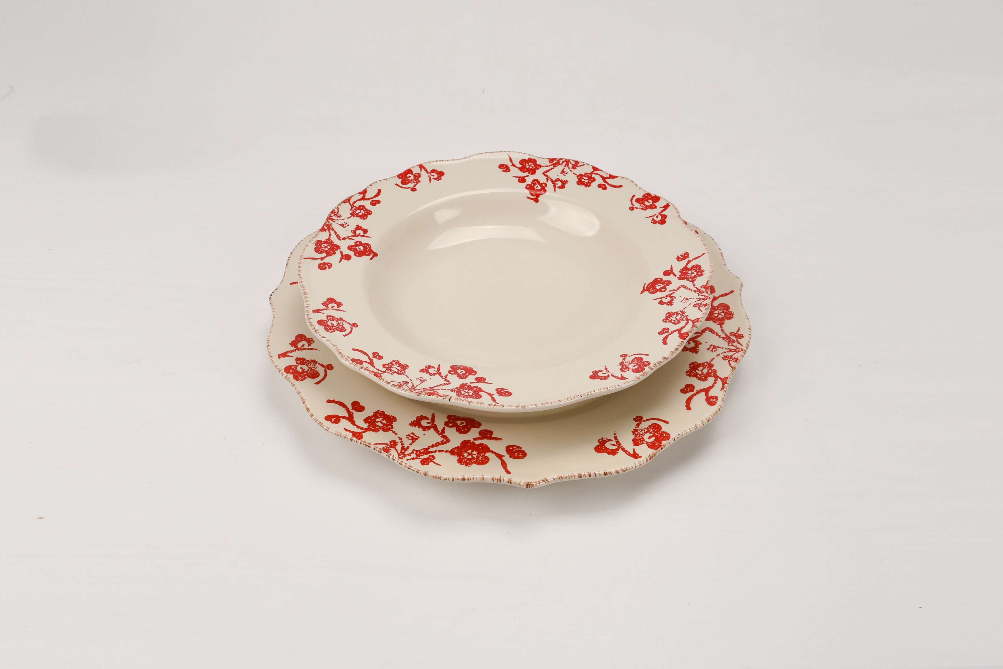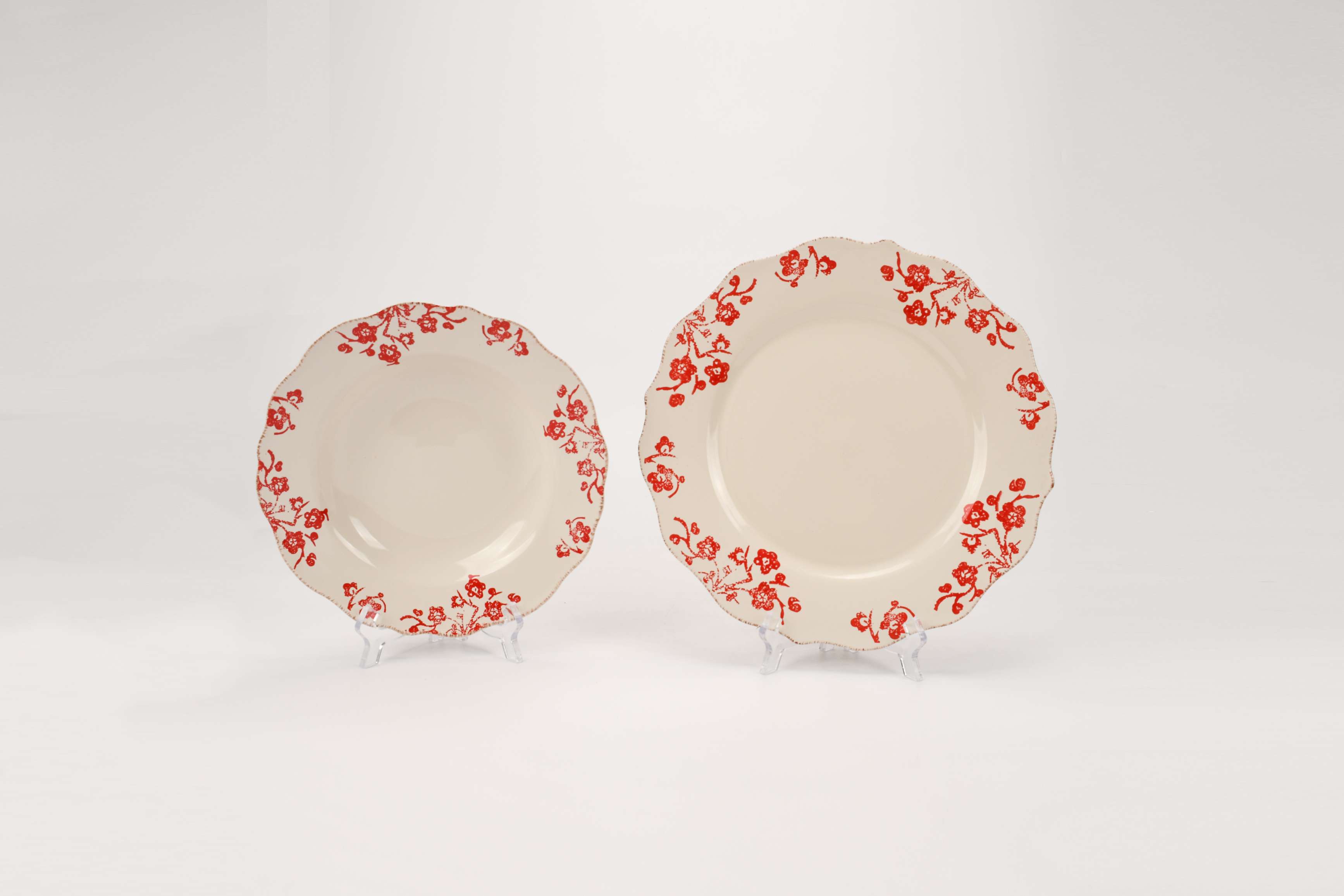 The beige porcelain with red plum pattern is like winter plum blossoms blooming, elegant and classical. The plate design is exquisite. Used to serve Chinese dishes and placed on the dining table, it fully shows the charm of oriental aesthetics and is an elegant choice for Chinese homes.